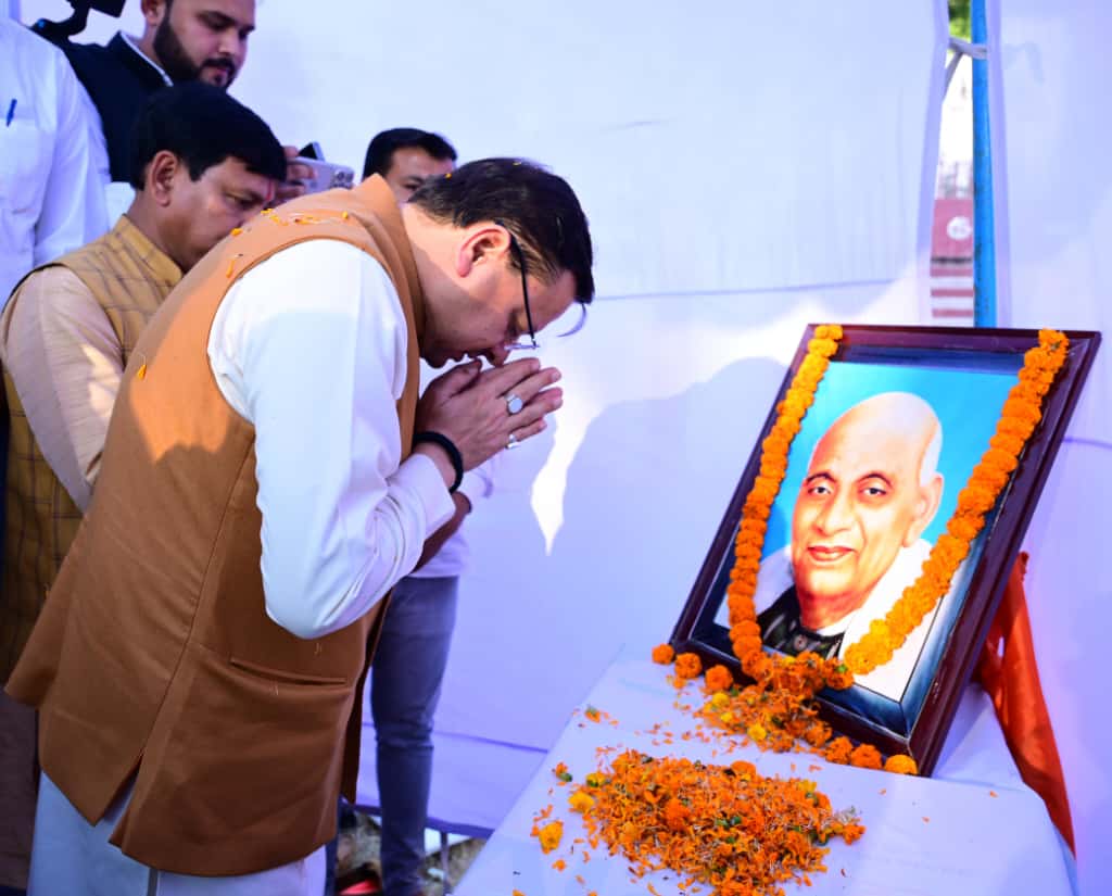 मुख्यमंत्री धामी ने सरदार पटेल की प्रतिमा पर पुष्प अर्पित कर श्रद्धांजलि दी और युवाओं को राष्ट्रहित में समर्पण का आह्वान किया